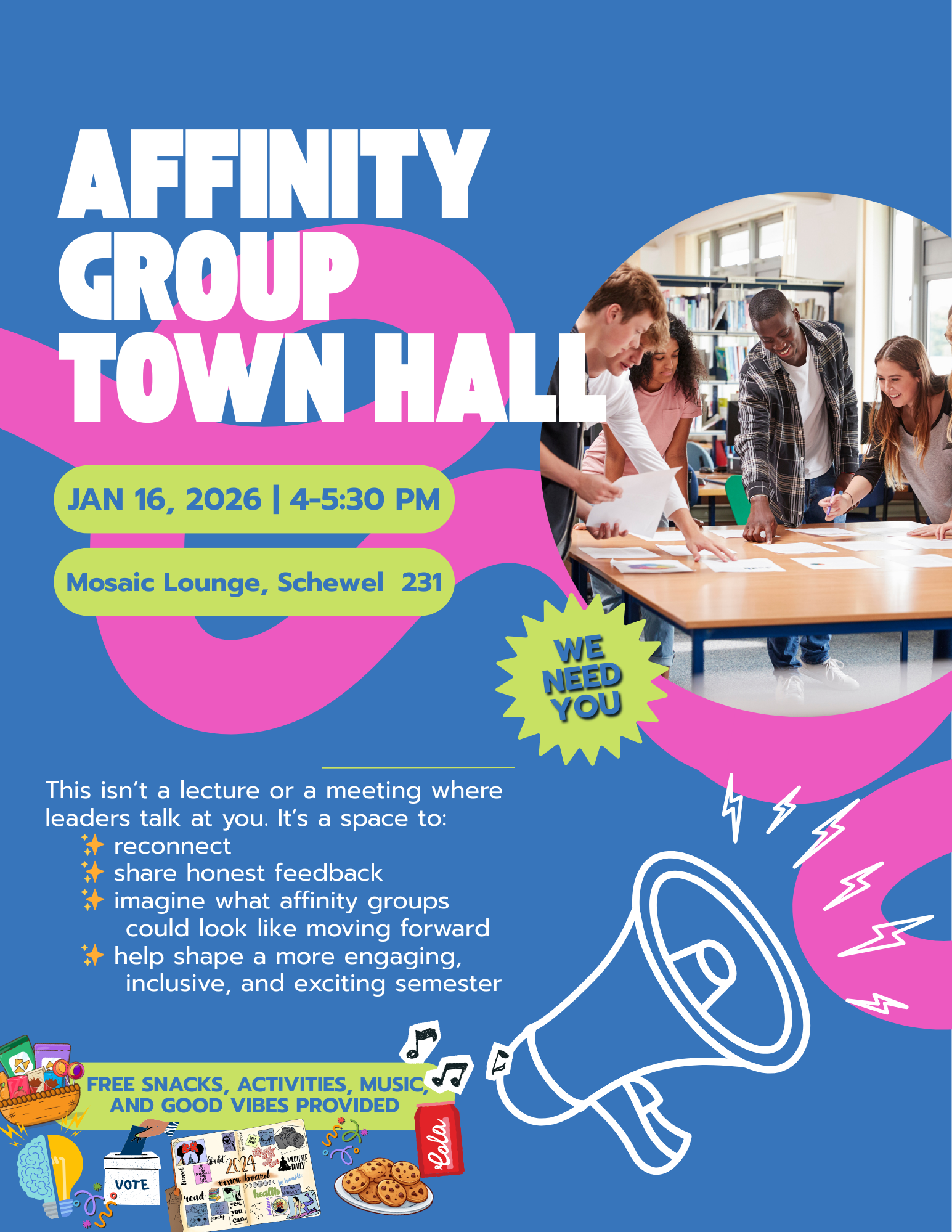 🍕 Free snacks, activities, music, and good vibes provided This isn’t a lecture or a meeting where leaders talk at you. It’s a space to:✨ reconnect✨ share honest feedback✨ imagine what affinity groups could look like moving forward✨ and help shape a more engaging, inclusive, and exciting spring semester What to Expect:- A warm, welcoming atmosphere (music, snacks, and space to mingle)- A brief look at where our affinity groups have been—and where we’re headed- Interactive activities to share what you want from affinity groups- Live voting to help prioritize events and initiatives for the spring- Easy, low-pressure ways to get involved (no leadership experience required!)