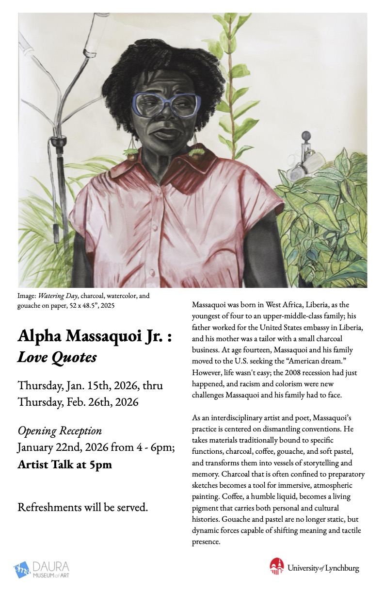 Opening ReceptionJanuary 22nd from 4-6 pmArtist Talk at 5 pmDaura Museum of Art is located in the Dillard Fine Arts Building.Refreshments will be served.